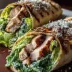 A delightful Caesar Chicken Wrap filled with zesty dressing, crispy romaine, and tender chicken, perfect for lunch or dinner.
