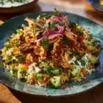 6. Assemble Salad: Start with a base of crispy rice on your serving platter. Top it with the sliced chicken, fresh vegetables, and herbs. Drizzle your creamy tahini dressing over everything. You can also garnish with pickles for an extra zing if that’s your style!