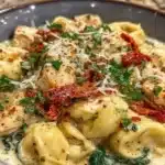 A comforting and elegant dish featuring tender chicken and cheese-filled tortellini in a rich, creamy garlic sauce with sun-dried tomatoes and fresh spinach.