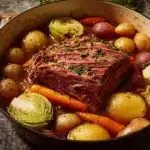 A comforting and delicious dish of tender corned beef, cabbage, and hearty vegetables simmered to perfection in a Dutch oven.