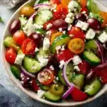 Picture this: it’s a sunny afternoon, and friends gather around the table, laughter bubbling over as you all enjoy a delicious meal together. In the middle of the spread sits a vibrant Greek salad, brimming with fresh flavors and beauty. This salad is more than just food; it represents a joyful moment of sharing and celebration. The zesty taste of ripe tomatoes, crunchy cucumbers, and creamy feta cheese creates a harmony that everyone loves. Whether it’s a weekday lunch or a lively family gathering, preparing this Greek salad brings everyone together, making it a special recipe I can’t wait to share with you.