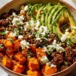 - Layer the roasted sweet potatoes, cooked ground beef, and cottage cheese in bowls. Drizzle hot honey over the top.