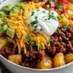 A warm and comforting Loaded Potato Taco Bowl featuring crispy roasted potatoes, savory meat, and fresh toppings for a delightful meal.