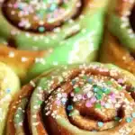 Fun and festive cinnamon rolls topped with vibrant green icing and rainbow sprinkles, perfect for St. Patrick’s Day.
