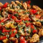 Now it’s time to bring everything together! Stir in the halved cherry tomatoes and let them cook for 2 minutes, allowing their juices to mingle with the other ingredients. Return the chicken to the skillet and add the fresh spinach along with the remaining oregano, red pepper flakes, and any additional salt and pepper. Toss everything together and cook for another 2-3 minutes until the spinach wilts down.