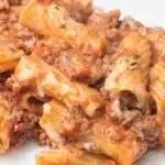 A hearty and cheesy baked ziti dish without ricotta, layered with pasta, meat sauce, and béchamel.