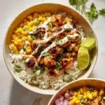 I still remember the first time I had a street corn-inspired dish; it was at a local food festival. The tantalizing aroma of grilled corn mixed with spices filled the air, and I couldn’t resist grabbing a bowl. The combination of sweet corn, juicy chicken, and creamy sauce blew my mind! Since then, I’ve wanted to recreate that magical dish at home, but with a twist. That’s how I came up with this Street Corn Chicken Rice Bowl. It brings all those amazing flavors together while being easy to prepare and a hit for the whole family. Trust me, once you try this, it might just become your go-to weeknight meal.