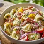 A vibrant and flavorful salad featuring cheese tortellini, salami, fresh vegetables, and Italian dressing, perfect for gatherings or a refreshing meal.